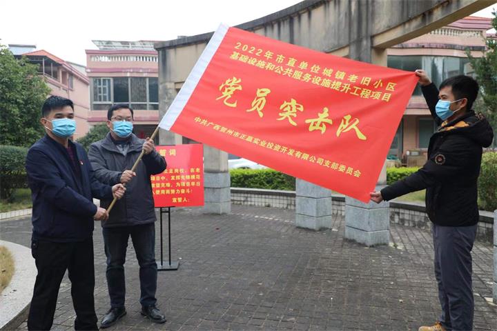 隨后,活動人員來到了賀州市檢察院生活小區,該小區是正贏實業公司負責實施的賀州市2022年市直單位城鎮老舊小區基礎設施和公共服務設施提升工程項目其中一個老舊小區。在老舊小區現場,支部開展了黨員對標承諾活動,并成立了2022年市直單位老舊小區基礎設施和公共服務設施提升工程項目“黨員突擊隊”。柳國忠強調,全體黨員要通過向身邊的優秀黨員學習并從中確立標桿和榜樣,在項目建設中以黨員的標準嚴格要求自己,帶頭攻堅克難,沖鋒在項目一線,更好的為人民群眾服務。